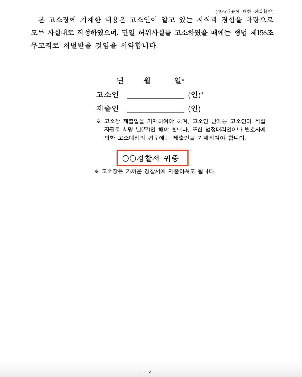 고소장 마지막 페이지는 고소 내용이 거짓 없이 사실대로 기재되어 있다는 확약내용으로, 만약 허위의 사실로 고소할 경우 형법 제156조 무고죄로 처벌받을 것임을 서약하는 것입니다.