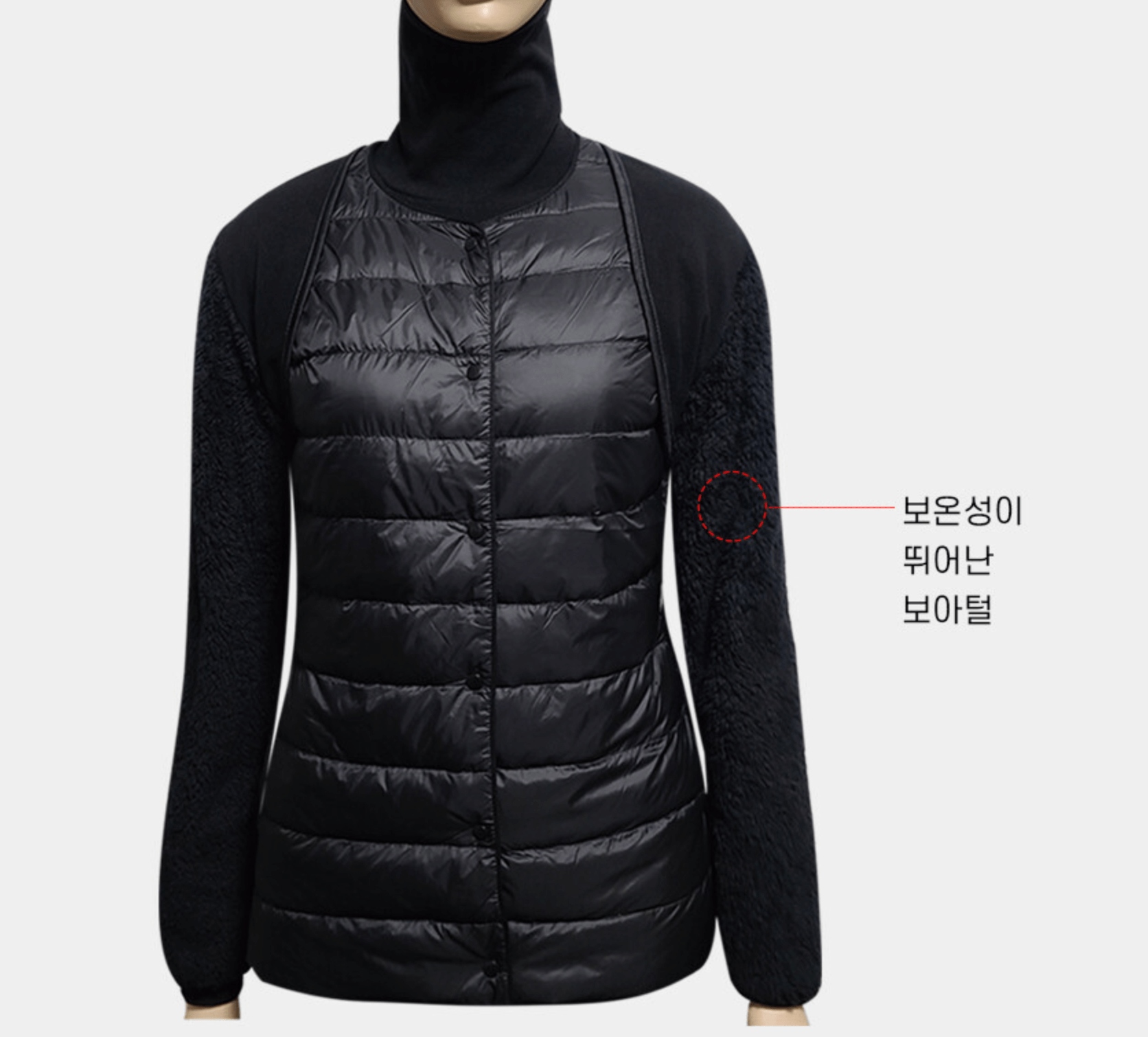 이 제품은 부드러운 보아털로 만들어진 것으로, 팔 부분까지 보온성이 뛰어난 특징이 있습니다.