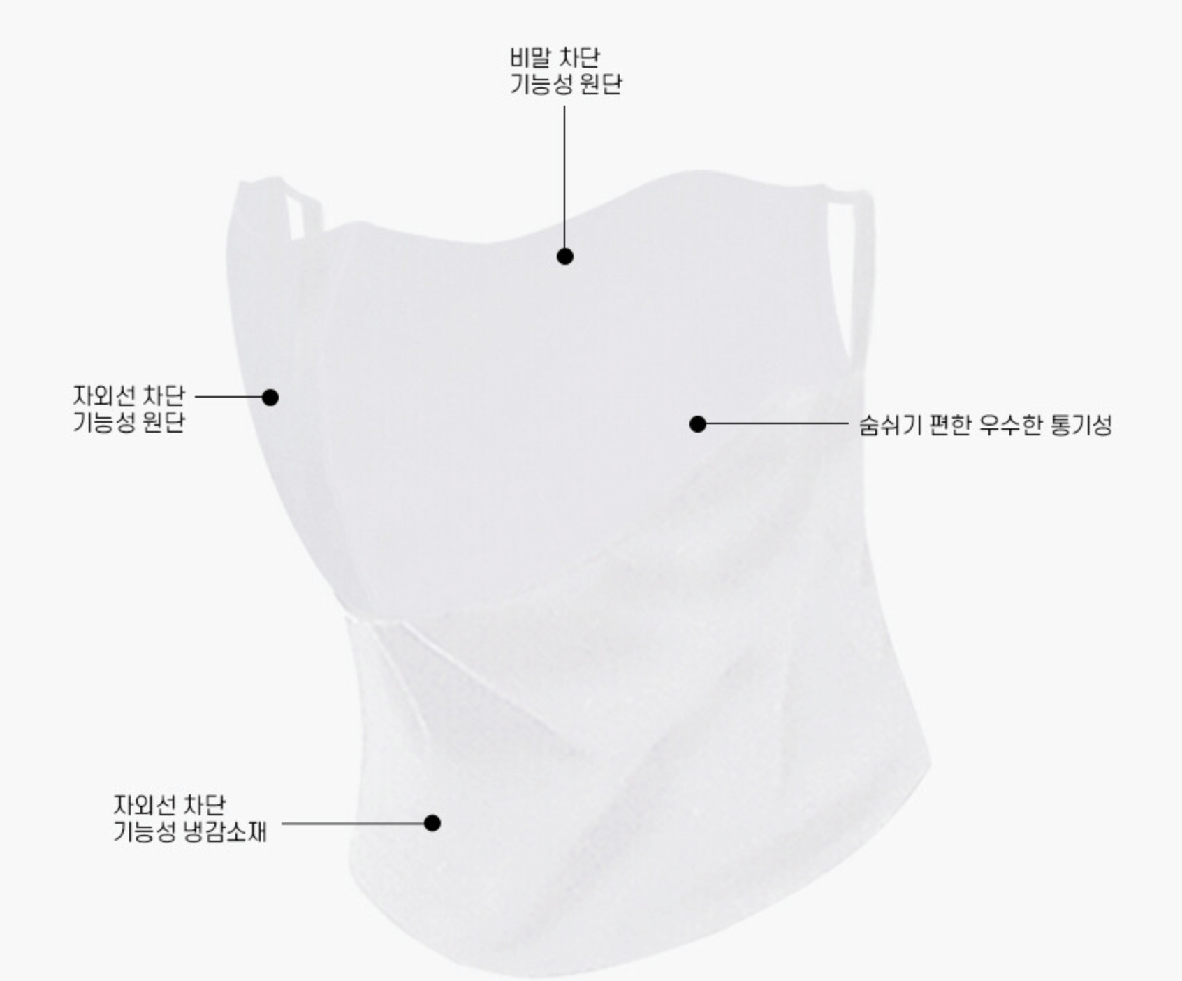 황사와 미세먼지, 각종 유해물질로부터 호흡기와 목을 보호해 주며 자외선 차단 기능성 원단을 사용하여 자외선으로부터 피부를 보호해 주는 제품입니다.