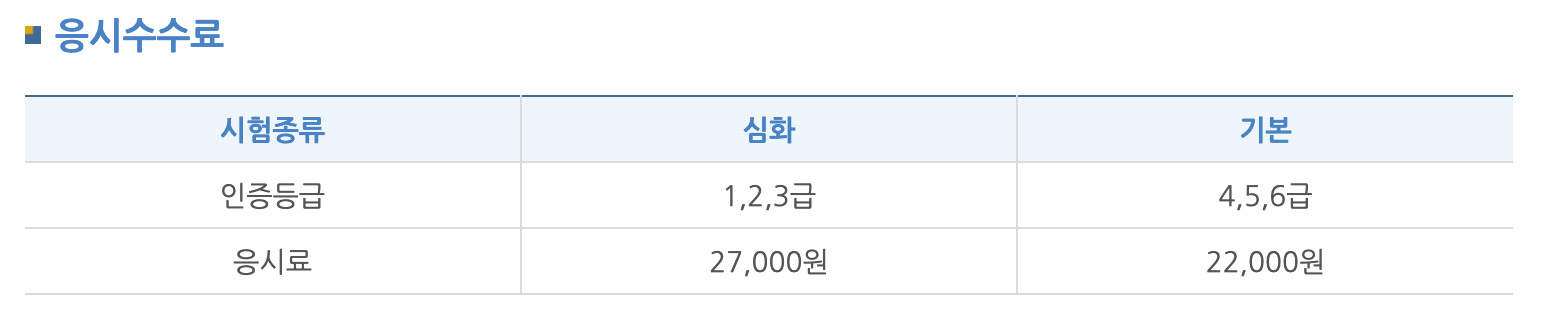 응시 수수료는 심화에 해당하는 1급, 2급, 3급은 27,000원, 기본에 해당하는 4급, 5급, 6급은 22,000원입니다.