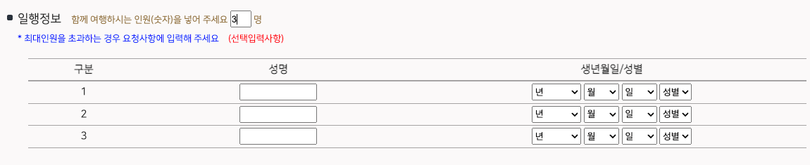해랑열차를 이용하는 일행의 성명, 생년월일, 성별을 입력합니다.