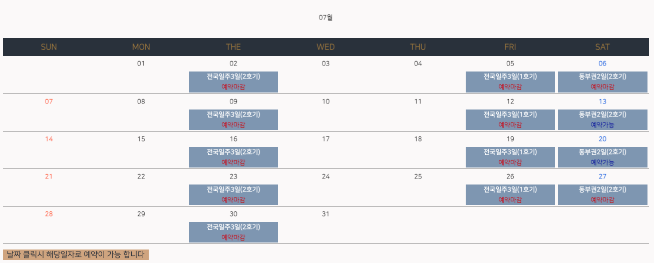 코레일 홈페이지에서 예약 일정을 확인합니다. 2024년 7월 예약 가능일(24. 6. 14. 현재)은 다음과 같습니다.