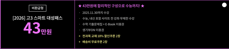 예비 고1의 경우 각 구매금액과 상관없이 모든 강의는 2025. 12. 31까지 들을 수 있고, 수학 기출문제집 및 E-Book 이용권, 생기부 ON 이용권을 받을 수 있습니다.