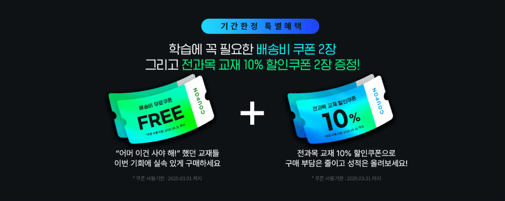 학습에 꼭 필요한 배송비 쿠폰 2장과 전과목 교재 10% 할인 쿠폰 2장이 증정됩니다.